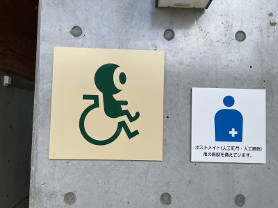 駐車場近くのトイレの標識。鬼太郎、猫娘、目玉おやじ。分かりやすいデザインで案内されていました。