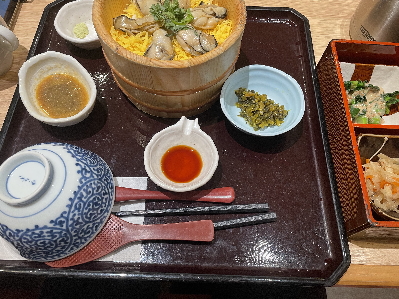 夕食は、福山駅の四六時中というお店へ。私は広島県産蒸し牡蠣バター醤油おひつごはんご膳(1680円)、かーちゃんはしらすご膳(1480円)を注文。