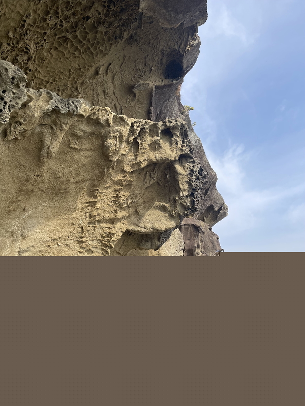 波蝕洞の入口はどれも鷹のクチバシように先端が尖り、天井部分には蜂の巣状の風蝕跡が見られ床面は板のように平らかな棚となっている。