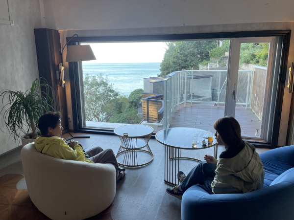 夕食前、南館1階の海のお風呂でさっぱり。その後東館RFのサンセットルームで夕日を鑑賞。