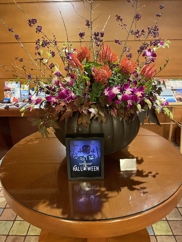 お腹いっぱい、大満足の夕食でした。ロビーのハロインの飾りつけが素敵でした。