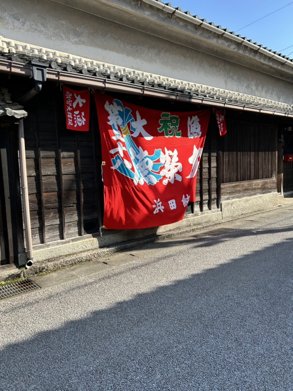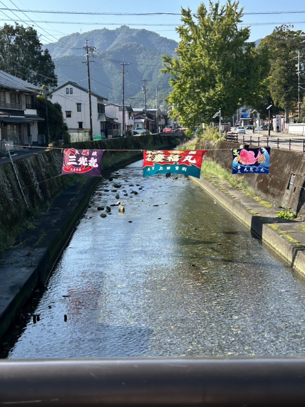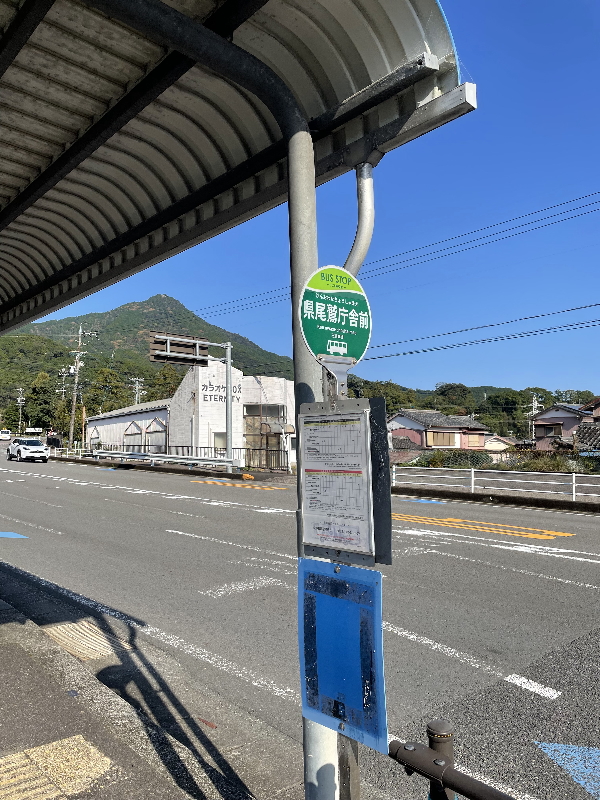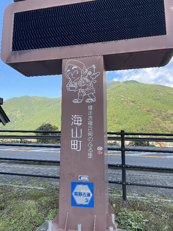 翌日にイベントがあったようで大漁旗が沢山飾られていました。海山に戻るバス停を探すが、私の地図アプリでは反対方向に進んでいて、かーちゃんの携帯で修正。尾鷲市総合庁舎前のバス停に着いたのは1分前でした。