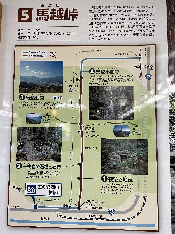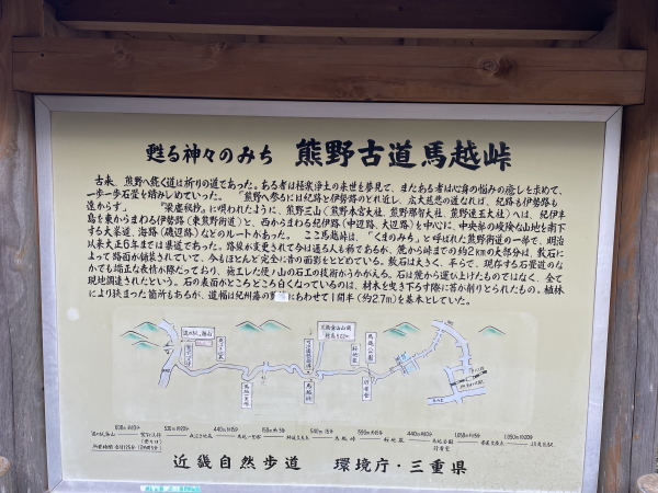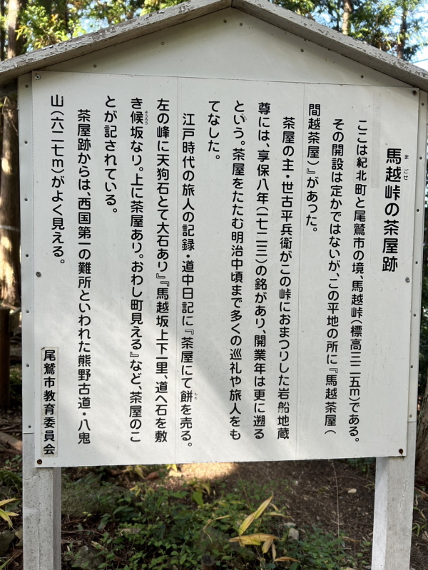 馬越峠は紀北町と尾鷲市の境界にある峠で、天狗倉山と便石山の間に位置する。峠越えの古道は桧の美林とシダに囲まれて約2kmにわたり石畳が敷かれていて、在りし日の様子が偲ばれる。