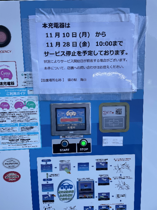 尾鷲からの帰りのバスの時間を考えて先にリーフ30分充電。10年たった充電器は来週から更新・撤去作業するとの張り紙がありました。今日からでなくてよかった。