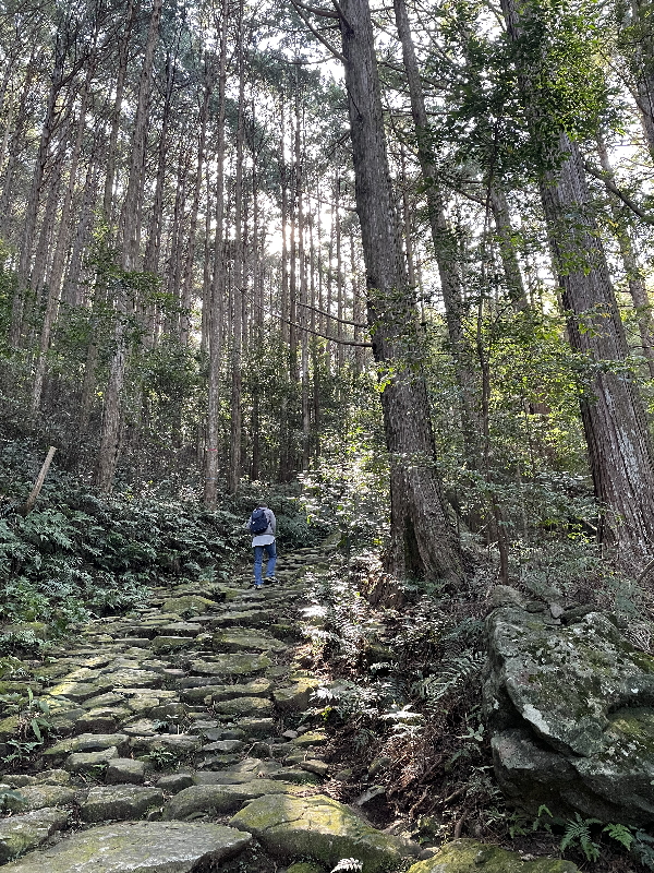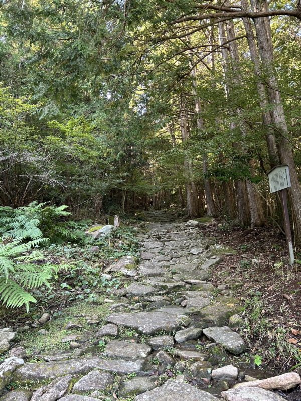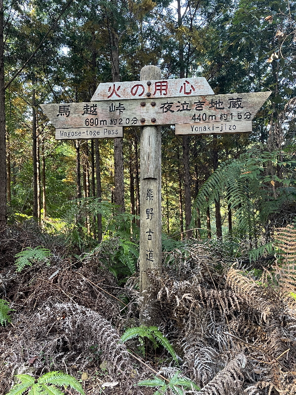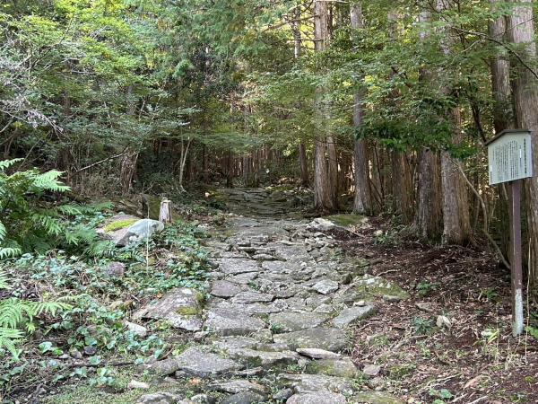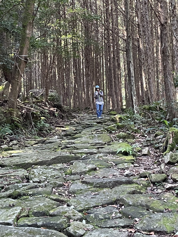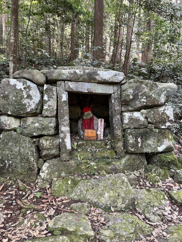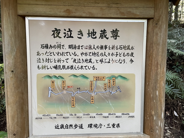 石畳を進んでいくと木製の道標がある。最初に見つけた道標には2/22と書いてあった。100mごとにあったようだ。400年前の江戸時代に紀州藩により整備された石畳。先に進むと夜泣き地蔵がある。