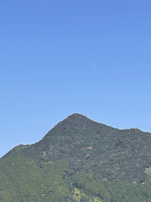 そこから見える青空と山。パラグライダーが青天にポツンと浮かんでいた。