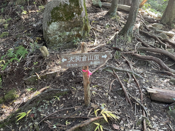 馬籠峠の茶屋跡に到着。方向を示す木の板には天狗倉山 600m、30分とある。