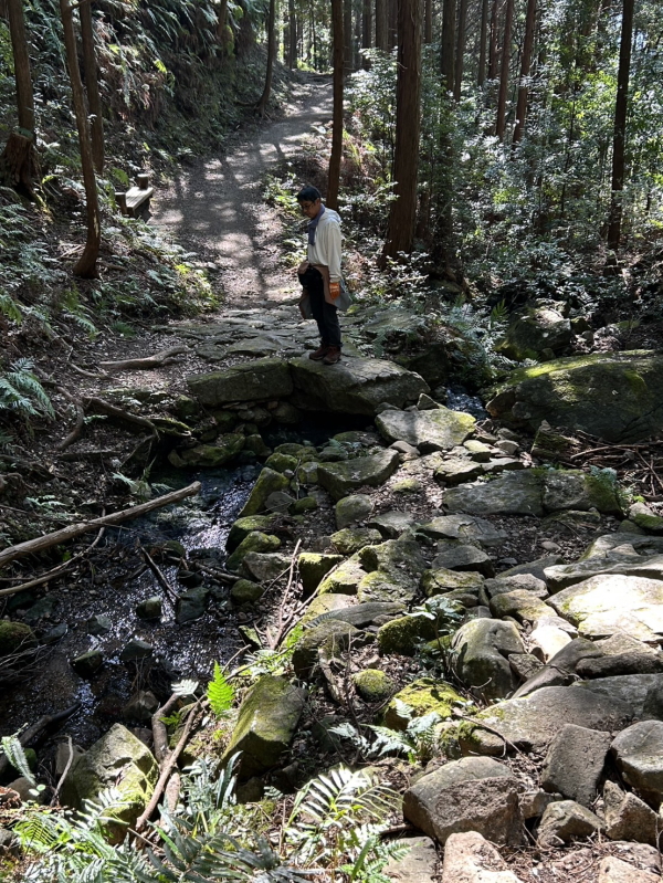 一枚岩の石橋を渡りさらに登ると林道と交差する場所にベンチがあり一休み。