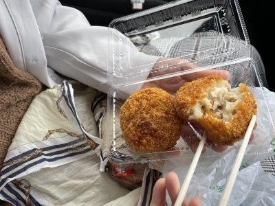 急に雪景色はなくなり、気が付くと星野リゾート奥入瀬渓流ホテルについた。ここで昼食用に買っていたホタテコロッケとマラソン大会でもらったパンを頂く。雨は小雨だったのでとりあえず十和田湖へ。湖に到着するもやはり雨と風で景観美はなく、すぐに帰路へ。