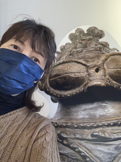 エントランスはとても高い天井。ロビーには岡本太郎作の「森の神話」というオブジェ。寒かったこの日は薪に火がくべられていました。